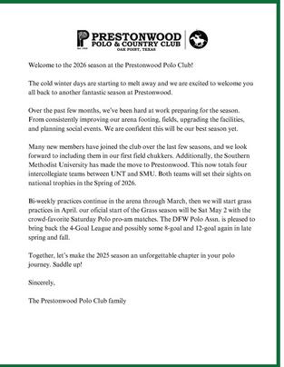 Sign up today online via PayPal or for more information please email info@prestonwoodpolo.com