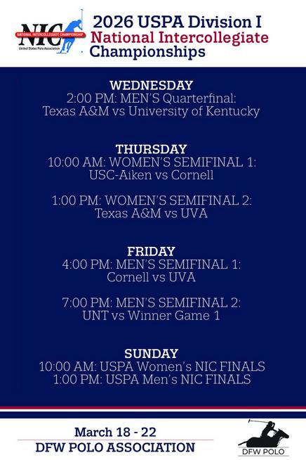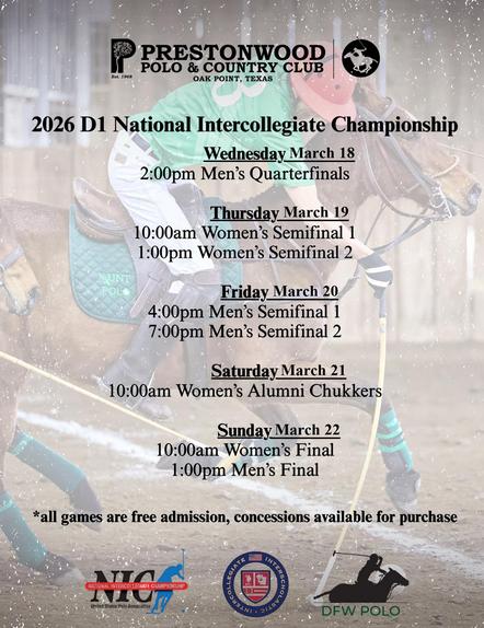This week DFW Polo Association and Prestonwood Polo Club welcome the top 9 mens and womens college polo teams in America for the USPA D1 National Intercollegiate Polo Championship March 18-22 in the Prestonwood Arena, Additionally on Saturay March 21 we're hosting the 50th anniversay of Womens Intercollegiate polo with an Alumni game in the Prestonwood Arena. The seeding for the National tournament is:
